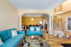 Welcome to this spacious and beautifully upgraded 6-bedroom, 3.5-bathroom walkout home backing onto a serene ravine, offering the perfect blend of privacy, comfort, and functionality. The main floor boasts an open and inviting layout, featuring a bright living room, a cozy family room, a formal dining area, and a sunny breakfast nook that overlooks the ravine. The kitchen is a chef’s dream, complete with solid wood cabinetry, granite countertops, stainless steel appliances, and a stylish insert hood fan. A deck overlooking the ravine is ideal for enjoying your morning coffee. A private office offers a quiet space for work, and the convenient half bath rounds out this well-appointed floor. Upstairs, the large master bedroom with a walk-in closet is a true retreat, featuring a luxurious 5-piece ensuite. The upper level offers 3 additional good-sized bedrooms and another full bathroom, making this home ideal for growing families. The fully finished walkout basement includes two more bedrooms, a full bath, kitchen, a large living area with projector electrical fittings and a covered porch - an illegal suite with a private entrance and excellent potential for legal conversion. The backyard is a great space to enjoy the summers and winters alike. Additional upgrades include a new roof (2025), upgraded hardwood flooring, central A/C, and an insulated, drywalled double garage. Ideally located in a family-friendly neighborhood, this home is just a short walk to Creekside Shopping Centre, SageHill Shopping Centre, Public transit, parks, and offers easy access to Stoney Trail—making daily commutes and errands a breeze. The house is located a short walk from a soccer and a baseball field that gets converted to an ice rink in the winters. This property boasts a bike, transit and amenity score of a 100. This is an excellent opportunity to own a move-in-ready home in a highly desirable and amenity-rich community.
