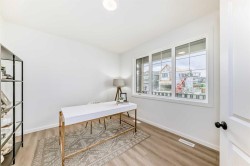 STARLING HAS BEEN QUIETLY BUILDING A REPUTATION—for calm streets, thoughtful design, and a nature-forward rhythm that buyers notice the moment they arrive. This home leans right into that energy. The WIDE FRONT PORCH sets a grounded first impression, and inside, natural light moves through the main floor with the kind of ease that makes the whole space feel instantly welcoming. Warm LVP, 9' CEILINGS, and a clean, modern palette work together to create that subtle “this feels right” moment you feel as soon as you walk in.And then there’s the FLEX ROOM.Framed with FRENCH DOORS and positioned with just enough separation from the main living spaces, it’s the RARE MAIN-FLOOR ROOM that feels truly intentional—not a leftover corner repurposed as an “office,” but a space with presence. It becomes whatever your life needs most: a polished workspace, a creative zone, a reading retreat, or simply a quiet room with a door when the rest of the house is in motion.The kitchen continues that thoughtful rhythm: QUARTZ COUNTERS, 42" UPPERS that keep the lines crisp, a CHIMNEY HOOD FAN that anchors the design, and storage placed exactly where real routines land. The SEPARATE SIDE ENTRY adds smart flexibility—practical now, and perfectly positioned for whatever plans come later.Upstairs, the layout stays calm and well-proportioned. Bedrooms sit where they should, offering both connection and privacy, and the upper laundry room keeps daily life where it actually happens. The primary ensuite is the unexpected luxury in this footprint: A SOAKER TUB, A TILE-AND-GLASS SHOWER, AND A DUAL-SINK VANITY—a trio rarely found together in homes this size, and one that quietly transforms both mornings and evenings.Outside, the REVERSE-PIE LOT is a meaningful advantage. It gives you a LARGER FRONT YARD AND A GENEROUS SIDE YARD, creating more breathing room, more natural light, and a sense of separation that’s uncommon in new communities. The off-street parking pad off the paved lane provides easy parking right at home—no street shuffle required. Add the REAR DECK with its BBQ gas line, front sod already in place, and 200-amp electrical service, and the long-term livability becomes clear.Set within steps of Starling’s PATHWAY NETWORK and nature-first streetscape, this is a home that blends light, flow, and flexibility with quiet confidence.BOOK A SHOWING and come see how naturally it fits the way you live. • PLEASE NOTE: Kitchen appliances are included, and will be installed prior to possession.