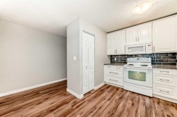 Fabulous location, and unit with a massive 35 foot balcony. This lovely large two bedroom two full bathroom home has been tastefully updated with Chilean pine laminate flooring throughout the custom kitchen and living room. The completely re-designed kitchen, features, quartz countertops, glass subway backsplash, newer cabinetry, and under counter lighting. Very private balcony with mature trees perfect for barbecuing and entertaining. Cozy up around the wood-burning fireplace during the chilly nights. The primary bedroom has a large walk-through closet to the master en-suite with tile flooring and a custom rainfall shower, engineered granite counters, and double sinks. In suite laundry and plenty of in suite storage. There is additional separate storage secure locker in the building. Just steps from transit shopping and medical centre this lovely property makes for a beautiful home.