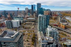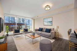 Welcome to the Evolution in East Village! Experience the best of urban living with restaurants, cafés, shopping, and entertainment just steps away. Enjoy riverfront pathways, parks, and easy access to transit—all from your doorstep.This 2-bedroom + den, 2-bath condo features a bright, open-concept layout with floor-to-ceiling windows and city skyline views from your balcony. The modern kitchen offers high-end stainless-steel appliances, granite countertops and backsplash, ample cabinetry, and a large breakfast bar—perfect for entertaining.Additional features include central A/C, in-suite laundry, and extra storage. Both bedrooms showcase downtown views; the primary bedroom has a walk-in closet and a 4-piece ensuite with granite finishes, while the second bathroom offers a fully tiled shower.Residents enjoy concierge and security services, fitness centre, saunas, steam room, party room, outdoor patio with BBQ area, heated underground parking, and a secure storage locker.Modern comfort meets convenience in the heart of East Village—city living at its finest! Call today for your private showing!