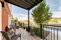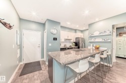 Welcome to the beautiful community of Grovenor and ever so charming Grovenor Manor. If you're interested in a quiet, boutique building with elegance and convenience this one is it! Inside this main floor end unit, you'll find a renovated 2 bed, 2 bath suite with gorgeous finishing. Elevated upgrades include - subway tile in both baths instead of baseboards, fresh paint throughout, board and batten in the living room and 2nd bedroom. Vinyl plank flooring and ceramic tile. Pot lights replace builder grade pendant lighting in the kitchen, venting redone in both baths professionally. New coil in heat pump good for 25 years. Immaculate stainless appliances including newer stove and brand new, full size dishwasher. Oversized island perfect for entertaining. Minutes away from the West Block community and future LRT station, great for downtown access. Enjoy summers on your large deck with gas bbq hook up. Beautiful, thoughtful Euro-inspired story book design, meticulously maintained and ready for a new chapter!