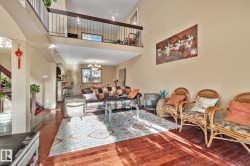 This stunning 2-storey home offers almost 2,400 sq. ft. above grade plus a fully finished basement! The grand foyer welcomes you with a soaring two-storey ceiling and elegant open staircase. The main floor features a formal living and dining area, gleaming hardwood floors, and a spacious kitchen with warm wood cabinetry, gas range, and views of the backyard. The cozy family room with a wood-burning fireplace opens onto the deck—perfect for entertaining. Upstairs, an open loft makes a great den, office, or reading nook, along with four generous bedrooms. The primary suite includes a walk-in closet and a private 5-piece ensuite. The finished basement adds a large rec room, bedroom, and full bath. Updates include two Carrier furnaces, a newer roof, insulation, paint, hot water tank (2020), and washer/dryer (2021). Located on a quiet cul-de-sac on a large pie-shaped, fully fenced lot, this home offers incredible space, comfort, and timeless charm!