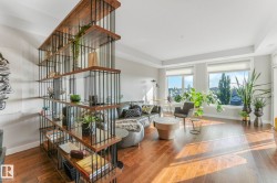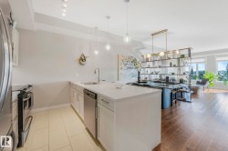SIMPLY ELEGANT! Walk up to the main entrance and marvel at the impressive landscaping with flowers as long as nature allows! Be impressed by the quality of the entrance foyer - both furniture and artwork. Central elevator and up you go to the top floor - soaring 9'ceilings, impressive unit doors set in to define your singularity. Enter to sunlight, to openness...with definition. In to the ideal kitchen w/sparkling porcelain white flooring, & quartz counters . The feature divider between the living & dining succeeds without separation - intriguing & unique. Primary suite boasts a deep & long bath w/separate glass shower plus an attached HUGE W/I closet/dressing room. A seating area & eating area are both easily handled by the sunny southwest-facing deck with a view of the neighbourhood. Just an easy walk to the Recreation Centre & schools, as well as the main bus centre.Large enough for house-like living - ideal storage, quality finishing, friendly neighbours, a HOME to love!