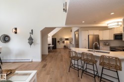 Great Value, Low Condo Fees & Prime Location ! Backs onto river valley trail system and just a short walk to farmers market & numerous amenities. Stunning, Unique & Immaculate! This 1,907sqft loft style condo is magazine ready. The unit has gone through a major renovation using tasteful, timeless and quality materials. The floor plan on each level was brilliantly planned leaving no wasted space. Upper level has been designated to the primary bedroom and Ensuite making up 771sqft. The fixtures are eye-catching and the high-end steam shower takes the space to another level. These two combined spaces will rival that of many homes far in excess of this price point. The 2nd bedroom is on the main with adjacent 4 piece bath. Balance of main level is open concept and lends well to accommodating large gatherings. Other features include 2 parking stalls, vaulted ceilings, large banks of windows, hardwood floors, gas fireplace & stainless appliances with induction stove. GREAT PUBLIC TRANSIT SERVICE TO EDMONTON!