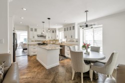 Desirable RANCHER in sought after central location. Perched up on an over 8000 sqft lot at the high point of the gated community offering excellent sun exposure and privacy. Vaulted ceilings and large windows highlight the front living room featuring custom millwork offering flexible use of the space for dining or entertaining. The Kitchen is gorgeous with Cambria countertops, gas range and large windows. This home is complete with 3 bedrooms, the primary bedroom is outfit with TWO walk-in closets and a spacious 3-piece ensuite. The outdoor terrace has a glass awning, landscape feature lighting, irrigation system & rough-ins for a hot tub. Bonus, 8x10 shed with power! Radiant in-floor heating to warm the home & brand new A/C. 2 Dogs or 2 Cats, or 1 of each allowed. RV parking available.