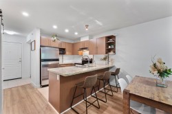 Top floor 1 bedroom + den at Memento in Brentwood. This bright, very well-kept home features an open layout with a spacious kitchen, granite counters, stainless steel appliances, and an eat-up bar. The living room offers an electric fireplace and access to a covered balcony. The bedroom includes a walk-in closet and cheater ensuite, plus a versatile den for office or storage. Includes parking, storage locker, and access to shared EV charging. Walk to SkyTrain, Brentwood Mall, schools, and parks—ideal for first-time buyers or investors.