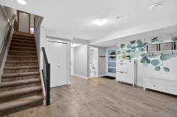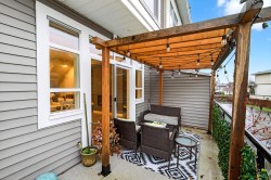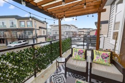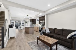 Welcome to this well cared for, 8 year old corner unit in Midtown with all the upgrades done. Stone countertops throughout, HW on demand, AC, privacy blinds, 12' vaulted ceiling in the master bedroom, double vanity in the Master bath, massive kitchen island, lots of cupboards, open concept living on main floor with 9' ceilings, large rec room & bathroom below, central vac and brand new high end Bosch dishwasher. Best location in the complex! Flex room below could be a 4th bedroom! Outside there is a fenced yard and a large beautiful 8x18 deck off the main with built-in pergola and privacy screens. This unit has the largest driveway in the complex big enough for large trucks and vans, as well as a large side by side garage. Tons of storage space in double wide garage.