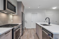Welcome to YOUR NEW HOME situated in the desirable Coquitlam West Neighborhood. This penthouse unit features 2 bedrooms + 1 den, in addition to 2 bathrooms. The unit boasts a Private 521 Sq Ft rooftop patio on the 7th Floor, equipped with its own hot tub and stunning views of the city and mountains! This unit has a modern layout with an open concept design, along with an 82 Sq Ft balcony off the kitchen. The interior space is furnished with Premium Kitchen Aid stainless steel appliances, gas stove, garburator, and quartz countertops. The laundry is conveniently located within the suite! The property includes 2 standard parking spaces (1 is EV ready) and 2 storage lockers. It is ideally positioned just steps away from the Burquitlam sky train station, shopping centers, schools and parks!