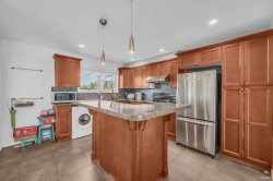 This well-maintained Chineside home offers stunning views of Burrard Inlet and the mountains. Features include an open kitchen with granite countertops, stainless steel appliances, a central island, and an updated main bath. The spacious basement includes a fireplace and secondary kitchen.Enjoy a large sundeck, fenced backyard, and convenient access to Mundy Park, shopping, transit, and Dr. Charles Best Secondary. Recent upgrades: new flooring, sundeck, washer/dryer (2021), and a brand-new furnace with central heating and A/C (2024),Cleaned all vents in March 2025, annual roof maintenance in place.