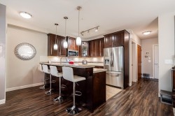 Yorkson Creek Walnut Ridge – highly sought after! Upsizing or downsizing is easy with this spacious 1,602 sq. ft. executive home (Style M2). Enjoy year-round comfort in the 202 sq. ft. solarium/enclosed balcony with retractable glass panels & gas BBQ hookup—perfect for extended living space. Two primary suites with ensuites on opposite ends for privacy. Den/flex area ideal for a home office. Kitchen offers ample cabinetry, S/S appliances incl gas range, & large breakfast bar. Features A/C + Heatpump, peek-a-boo park view, 2 parking (1 oversized) & xl secure locker. Great walkability—close to shops, parks, rec & Hwy access!