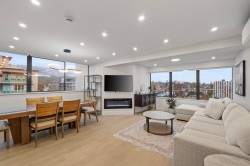 Welcome to Eastern House and this beautifully renovated penthouse. With over 1,600 sq. ft. on two levels, this home offers 3 bedrooms, 2.5 bathrooms, and a den. The main floor features an open layout with a stunning kitchen including quartz counters, a waterfall island, and custom cabinetry. Spacious living and dining areas plus a bright home office complete the space. Upstairs are three bedrooms, two bathrooms, laundry, and an enclosed balcony. Enjoy mountain views from every room. Renovations were completed in January 2024. The home comes with A/C, two parking stalls, and a storage locker. Located in the heart of Central Lonsdale—steps to shops, restaurants, transit, the library, and the rec centre. Walk score 86. Welcome home. Open House Sunday Dec 21th 2-4PM