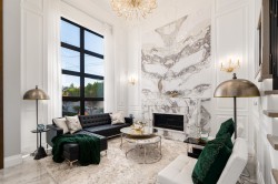 Elegant and luxurious custom home in prestigious Granville area! North–South facing with a grand foyer featuring a stunning circular ceiling design and artistic wall accents. Italian marble flooring throughout, adorned with dazzling chandeliers. Spacious family room boasts a soaring vaulted ceiling, custom marble wall panel, and a warm fireplace. Gourmet kitchen with European marble countertops, top–tier Miele appliances, and premium cabinetry. Two master bedrooms, one with an expansive sundeck; all four upstairs bedrooms include walk-in closets. Legal suite below. Smart home system with motorized curtains, A/C, HRV, Hikvision intercom. Enjoy a fully equipped media room with wet bar, plus a private sauna. A true masterpiece for the discerning buyer!