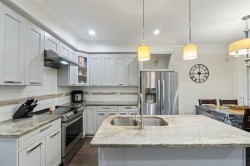 Welcome to the Highland Grands. This centrally located and freshly painted 4-bedroom, 4-bathroom townhouse offers over 1,800 sq. ft. of bright, open living in a quiet 10-unit complex. The home features newly painted kitchen cabinets, updated lighting fixtures, and refreshed bathrooms with newly painted vanities and updated shower trims. Enjoy a walkout covered patio and a large fenced backyard backing onto a greenbelt for added privacy. Additional highlights include stainless steel appliances, granite countertops, 9 ft. ceilings, and a basement with a bedroom, full bath, and rec room. Laundry appliances and stove are just two years old. Includes 3 parking spaces (1 covered). Close to transit, shopping, the rec centre, and Sullivan Secondary. Call now to view.