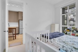 Beautifully bright and spacious one-bedroom corner home offering approximately 625 sq. ft. of well-designed living space, enhanced by an oversized wraparound balcony with peaceful courtyard views. This standout suite features soaring ceilings, elegant herringbone flooring, and an open-concept layout with upgraded composite stone countertops, stainless steel appliances, and in-suite laundry. Floor-to-ceiling windows flood the living area with natural light, while quality window coverings ensure comfort and privacy. Two secured parking stalls included. Situated just steps from parks, schools, shops, and everyday conveniences.