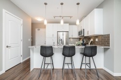 Your next home at Waterstone awaits you! This spectacular 2 bed, 2 bath+den home overlooks the peaceful water features & lush landscaping of this award winning development. It has been beautifully designed with luxury finishes like white shaker cabinets, full slab granite counter tops, wide plank vinyl flooring, full-sized stainless steel appliances, on-demand hot water tap, and an abundance of in-suite storage. Included are TWO side-by-side parking stalls with with TWO private mini garages. Enjoy exclusive access to Waterstone’s resort-style amenities: indoor pool, fitness centre, 17-seat theatre, sauna, chef’s kitchen, and more!! This home is move-in ready, and just steps to Willowbrook Mall, shops, dining and future Skytrain—this one checks all the boxes. Come see it for yourself!