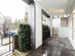 Welcome to AMBRIA by Mosaic Homes. Luxury ground level 657 sqft one bedroom plus 1 den with separate entrance. A fenced large east facing private patio. 7' high and double-wide picture windows stream natural light into bedrooms and living spaces. Wall-mounted and integrated Fulgor Milano cooking systems surround a peninsula kitchen with plenty of cabinet and counter top space. Dropped ceiling defines the kitchen space with expansive outdoor living, which extends the open plan living area creating more livable space. Walking distance to Canada Line and bus station, Langara College and Golf Course. Churchill Secondary High School, Jamieson Elementary. One parking with EV charger.