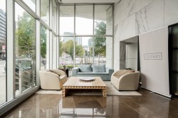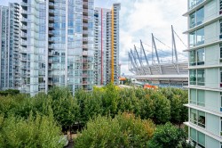 This one offers all the perks that you are looking for! Bright & spacious 1 bed + den + solarium comes with 1 parking + 1 storage locker + 1 bike locker, located at the quiet side of the building with greenery courtyard/city & peak of water views. Featuring smart efficient layout with no wasted space; floor to ceiling windows; good sized bedroom easily fits a king sized bed; versatile den and solarium can be used for office, additional storage, nursery or even a small bedroom. Great location, walk to Skytrain, Costco, Rogers Arena, restaurants, etc. everything that downtown Vancouver offers. Residents enjoy 24hr concierge, exclusive access to indoor swim pool, gym, bowling alley, sauna/steam room, rooftop terrace with bbq/hot tub and much more.