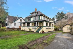 The Claremont Estate is a rare opportunity to own one of Samuel MacClure’s most iconic Edwardian Foursquare designs. Distinguished by its classic shingled façade, bell-cast hipped roof, and impressive wraparound balcony, this heritage home showcases Maclure’s signature craftsmanship at every turn. Inside, original fir floors, custom woodwork, French doors, stained glass, and four tiled fireplaces create a warm, timeless atmosphere. Professionally converted in 1934 into a legal DUPLEX (income suites), plus a unique attic great-room suite, the property offers over 4,000 sq. ft. of versatile living space. Numerous modern upgrades provide safety, efficiency, and turnkey comfort while preserving the home’s historic character.Located on a quiet, tree-lined street just a short walk to Dallas Beach, the Claremont estate is an exceptional heritage landmark in a highly desirable, family-oriented neighbourhood.