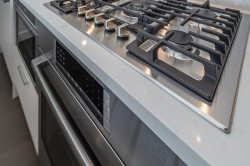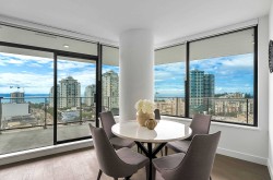 Brand new home exudes elegance and sophistication in the bustling heart of White Rock. This south- west corner 975 sf, 2 bdrm + den, 2 bath residence, with expansive 433 sf wrap-around balcony, boasts breathtaking 11th floor panoramic ocean and Gulf Island views. It showcases bright, open layouts, over-height ceilings, elegant finishes, air-conditioning and custom roller blinds. The modern kitchen features sleek, soft-close cabinetry, panelled Bosch stainless steel appliance package and a polished quartz, waterfall edge island, complemented by a contemporary color scheme and warm under-cabinet lighting. King-sized master bedroom has ensuite with quartz countertops, dual sinks and Grohe plumbing fixtures. Includes gas hook-up for BBQ, an EV-ready parking stall and storage locker.