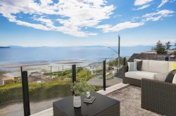 Panoramic ocean views spanning 180 degrees, no wires & majestic Mount Baker views East. An exceptional quality renovation in 2022 + new roof & interior designer used. Precision craftsmanship . Custom cabinets, superior workmanship evident in bathrooms, kitchen, living room built-ins, millwork and family room. Quality lighting fixtures & forged steel hardware. Beautiful German white oak wide plank hardwood flooring. H/E nat gas fireplaces. Quality windows exposing maximum sublime views on a whisper quiet street. Sundecks 653SF. Backyard shade oasis w/ ocean view down the pier, 187SF patio w/ water feature. Potential for two bedroom suite below 915 SF. Double garage & driveway for 2 vehicles. Schools: Semiahmoo Sec.& Bayridge Elem. Walk to Beach and Centennial Park.