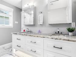 This beautifully updated bungalow, fully renovated in 2019, is nestled in a sought-after neighbourhood on a cul de sac. It offers stylish comfort on a meticulously maintained private lot. Step inside to find stunning hickory hardwood flooring throughout the main level, a cozy yet spacious living room, a bright dining area, and a modern kitchen featuring granite countertops, a center island with breakfast bar, and an open-concept design perfect for entertaining. The main floor also offers three generous bedrooms, including a primary suite with a large closet with custom built ins and full ensuite bath featuring a custom vanity with double sinks and glass shower with rainforest shower heads & Italian marble. An additional main level full bath features the same granite countertops as the other bathrooms. The fully finished lower level features a large family room with a propane fireplace, two additional bedrooms, a full bath, a den or office, laundry room, storage room, large custom built walk in closet and utility room—with convenient walk-up access to the garage. You can also enter through the double attached garage, where you will be welcomed by a thoughtfully designed mudroom, offering a practical space for the organized storage of outerwear and daily essentials. Outside, enjoy a large, private lot adorned with lush trees, vibrant shrubs, and thoughtfully selected plants—all beautifully maintained for exceptional curb appeal. The stone patio and matching stone retaining wall perfectly compliment the mature perennial garden. Don’t miss this move-in-ready home in a peaceful and well-established community. Close to English and French elementary and junior high schools.