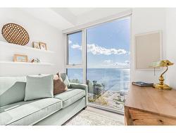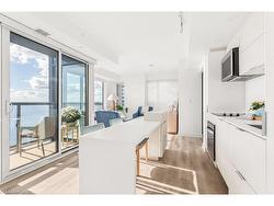 Experience luxury lakeside living at its finest in this stunning 2-bedroom, 2-bath suite at the iconic Nautique Lakefront Residences in the heart of downtown Burlington. Floor-to-ceiling windows fill the space with natural light and frame spectacular panoramic views of the lake and vibrant cityscape. The open-concept layout features a designer kitchen with integrated appliances, quartz countertops, and modern cabinetry that seamlessly blend style and function. The spacious island doubles as a dining space, perfect for entertaining or casual meals. The primary bedroom offers ample closet space with custom built-ins and a spa-inspired ensuite, while the second bedroom is ideal for guests or a home office. Enjoy the convenience of in-suite laundry and automatic custom blinds. Step outside to your private balcony and take in the ever-changing waterfront views. Enjoy world-class amenities including a state-of-the-art fitness centre, resort-style outdoor pool with cabanas, hot tub, yoga studio, fire pits, barbecue terrace, and elegant resident lounge/party room with dining area and kitchen. Concierge service, executive meeting rooms, bike storage, secure underground parking, and a private storage locker complete this exclusive lifestyle package. Located steps to the lake, restaurants, boutiques, and the waterfront trail, this is downtown Burlington living at its most sophisticated.