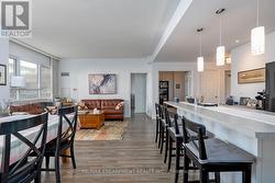 2-bedroom PLUS a den, 2 full bath condo in the heart of downtown Burlington! Over 1300 square feet with a sprawling, open concept floor plan! This unit has been beautifully maintained and is situated in the sought-after Baxter building. The unit boasts an oversized living / dining room with plenty of natural light. There is also access to the large terrace with beautiful eastern exposure. The eat-in kitchen features a large island, white cabinetry and stainless-steel appliances. The primary bedroom has a walk-in closet and a spacious 4-piece ensuite with a separate tub and shower. There is also a spacious 2nd bedroom and 3-piece main bath! The oversized den offers several possibilities and is a great added bonus! This unit also includes in-suite laundry and plenty of storage space! Building amenities include a rooftop terrace with BBQs, a party room, a gym, sauna, & carwash! TWO underground parking spots and TWO storage lockers (one on the same floor as the unit). A perfect unit for anyone looking to get downtown Burlington and all it has to offer! (id:27)