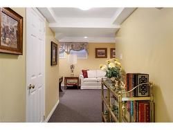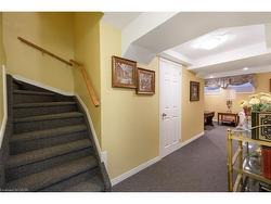 Welcome to Tyandanga — a serene Burlington neighbourhood known for mature trees, green space, wooded ravines, huge parks & the prestigious Tyandaga Golf Course. Nature lovers will appreciate the nearby Niagara Escarpment, Bruce Trail & conservation areas offering endless outdoor adventure. Enjoy this quiet, established community that feels tucked away in nature, yet is close to shopping, restaurants, & services, & offers quick access to the QEW & 407 ETR for commuters. This highly desirable end-unit townhome is part of a small, beautifully maintained enclave of only 34 homes. Set on a premium private lot, it features a rarely offered attached double garage with inside entry, 2 bedrooms, 2.5 bathrooms, extra windows, & approx. 1,629 sq. ft. of light-filled living space plus a professionally finished basement. Hardwood floors on 2 levels, French doors, 2 gas fireplaces, & California shutters contribute to timeless elegance & there is fresh paint in the entrance, kitchen, & 2 bedrooms. The spacious living room, centred around a gas fireplace, opens to a private patio surrounded by lush gardens, brick privacy walls, a mature tree, & metal fencing with a gate access to green space. French doors connect the living & dining room — perfect for formal entertaining. The bright white kitchen offers ample cabinetry, an upper china cabinet, Corian counters, white appliances (including a new stove), & a breakfast area. The family room with a gas fireplace is located on the mid-upper level; 2 bedrooms & 2 full baths are on the upper level. The freshly painted primary suite features large windows with California shutters, a walk-in closet & a 4-piece ensuite with a soaker tub & separate shower. The finished lower level includes a spacious recreation room with pot lights & a large laundry room with extensive cabinetry & a new Maytag washer & dryer.