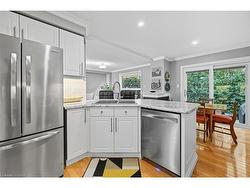 Looking for the sweet spot between “too much house” and “not enough space”? This townhome in Barrington Square might be your Goldilocks moment. Set at the back of the complex for privacy, you’ll find a double garage and driveway… so yes, you can both park inside! Inside, the owner’s meticulous care shows at every turn: hardwood floors, crown moulding, updated kitchen with stainless appliances including induction stove. Walk-out onto the patio perfect for summer dinners under the electric awning while you cook on the gas line BBQ. Upstairs, the primary suite feels like a retreat with vaulted ceilings, walk-in closet and large spa-like ensuite. A second bedroom with its own ensuite access, plus a third bedroom currently used as a den, gives you flexibility without the fuss. Laundry is conveniently upstairs too! The finished basement adds even more living space with a third full bath but doesn’t sacrifice the great storage space either. Lawn and snow care are included so your weekends are free for Central Park strolls or Peach Coffee Co. coffee runs.