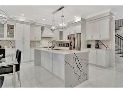 Welcome to 7 Bernini Court a beautifully appointed 3,480 square foot two-storey home located in a quiet, family-friendly neighbourhood on Hamilton's West Mountain. Set on a generous 109 x 217 ft lot, this property offers impressive curb appeal with professionally landscaped front and rear yards, creating a peaceful, resort-like atmosphere. The large driveway provides parking for up to nine vehicles and leads to a spacious three-car garage. Step through grand 8-foot double doors into a bright, two-storey vaulted foyer that sets the tone for the homes open and airy layout. The main floor features elegant 30 x 30 white porcelain tile throughout the dining room and eat-in kitchen. A clean, modern design includes white cabinetry, quartz countertops and backsplash, a built-in espresso station with full-height pantry storage on both sides, and a large island perfect for everyday meals or entertaining. Sliding doors off the dinette lead to a 16 x 35 ft covered porch overlooking the backyard oasis complete with a 16 x 32 ft inground saltwater pool, ideal for hosting family and friends. Upstairs, you'll find four spacious bedrooms and two well-appointed bathrooms, along with a convenient laundry room all featuring heated floors. The finished basement includes a self-contained one-bedroom apartment with a separate entrance, perfect for extended family or rental potential. This home offers comfort, space, and style a great fit for families or those looking for flexible living options in a desirable location.