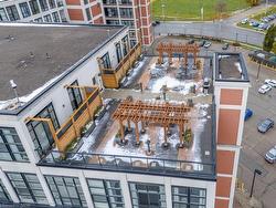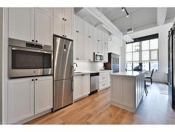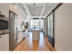 Welcome Home to the historic Kaufman Lofts in the heart of the Innovation District! This stunning 2-bedroom loft perfectly blends urban style with contemporary comfort. Featuring 14’ ceilings, luxury vinyl plank flooring, and custom barn doors, this open-concept space exudes character and sophistication. The modern kitchen showcases extended-height cabinetry, a large working island with seating, quartz countertops, and stainless steel appliances, ideal for both everyday living and entertaining. Enjoy an abundance of natural light through oversized windows and take advantage of custom built-in storage in each bedroom, plus the convenience of in-suite laundry. Residents of Kaufman Lofts enjoy access to premium amenities including a rooftop patio with community BBQ and dining area, a meeting/party room, bicycle storage, and visitor parking. Located just steps to the new Google Office, Sun Life and Manulife head offices, as well as restaurants, shops, and LRT transit, this loft offers the ultimate downtown lifestyle.