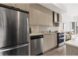 Elite DTK condo! 505 maximizes utility of the space and achieves a grand feel with the tall ceilings, open concept layout, and unobstructed easterly Kitchener skyline views. This unit sits at the same level as the roof top patio with BBQ access just down the hall. The eat in kitchen with center island, contemporary cabinetry, stainless steel appliances, and quartz countertops is open to the versatile living room space, which sits parallel to the bedroom and both overlook the 204 sq ft private terrace, bringing the total indoor/outdoor size of the unit to 675 sq ft. Click flooring flows throughout the unit. One of the most successfully integrated condo buildings in the downtown core, reconstructing the John Forsyth Shirt Company, Duke Street level façade & capturing the historic landmark while moving the city forward with urban renewal. The building amenities are impressive; a clean and modern lobby with a full-time concierge service, comfortable sitting spaces and open to the ground level state of the art fitness center, complete with heavy bags and exercise bikes surrounded by windows connecting you to the outdoors. Truly unique is your ability to take your fitness journey outside to the 25th floor, roof top running track while you enjoy the stunning 360-degree views. When its time to relax or entertain larger groups, take advantage of the 5th floor, furnished patio and party room, overlooking the Duke Street forecourt. The building also includes car wash station, dog wash station, and artificial turf dog walk. Short walking distance to Victoria park, charming cafés, popular restaurants, boutique shops, and LRT. Downtown Kitchener is changing to become a popular urban center and now is the time to take advantage. Don’t miss out