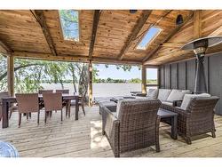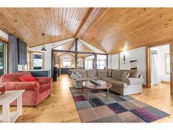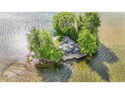 Welcome to your island paradise on Somme Island, located on the largest Kettle Lake in all of Ontario, Puslinch Lake. This one-of-a-kind property offers the ultimate in seclusion and natural beauty, with a picturesque setting and modern comforts throughout. Accessible only by water, the island features three separate boat docks for arrival, while a spacious parking lot on the mainland offers convenient vehicle access for you and your guests. As you step into the main residence, you'll be greeted by the warm charm of pine wood flooring that flows throughout the main level, creating a cozy, rustic ambiance. The kitchen is a chef’s dream, featuring granite countertops, a travertine tile backsplash, stainless steel appliances, under-cabinet lighting, and a large center island perfect for both meal prep and casual dining. The stunning living room is highlighted by a wood-burning fireplace set against a dramatic stone wall with a large hearth – the perfect spot to unwind on cool lake evenings. The main-level primary bedroom offers sliding glass doors that open directly onto the deck offering seamless indoor-outdoor living. Large windows frame tranquil lake views, making every morning feel like a getaway. Relax in your stunning sunroom, complete with a hot tub, skylights, and breathtaking lake views. A unique spiral staircase leads to the upper level, where you'll find two additional bedrooms, each with pine wood flooring. One of these charming rooms includes a walkout to a private balcony – the perfect place to sip your morning coffee while taking in the serene surroundings. Surrounding the home is over 7 km of private shoreline, a grassy area, docks, fire pit, and 3 decks, all ideal for playing, fishing, swimming, sunbathing, and lakeside relaxation. Whether you're looking for a summer escape or a year-round sanctuary, this exceptional island property offers a rare opportunity to own your own slice of paradise!