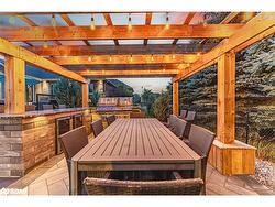 OVER 4,000 SQ FT OF LUXURY, PREMIUM UPGRADES, & RESORT-STYLE OUTDOOR LIVING WITH AN INGROUND POOL & COVERED LOUNGE - ALL IN THE HEART OF SNOW VALLEY! Located on a quiet cul-de-sac surrounded by mature trees and rolling greenspace, this showstopping bungaloft offers a rare blend of privacy and outdoor luxury in a coveted neighbourhood. Enjoy a tranquil lifestyle in a safe and established community just minutes from hiking, golf, and conservation areas, with Snow Valley Ski Resort, downtown Barrie, and Hwy 400 all close by. Set on an expansive lot, this home delivers a backyard that rivals a resort, complete with an 18x44 ft inground pool with 3 waterfall features and full sun exposure, plus a relaxing hot tub on the spacious deck. The outdoor pergola-covered kitchen and dining area delights with a built-in BBQ, granite counters, and an adjacent lounge with a wood fireplace, ceiling fan, and TV mount - perfect for evenings under the stars. Professionally upgraded with built-in irrigation, outdoor speakers, automatic lighting, and full fencing, every inch of the exterior has been designed for comfort and indulgence. Inside, the open layout flows through the eat-in kitchen and living room, anchored by a gas fireplace and a walkout to the deck for seamless indoor-outdoor connection. A formal dining room adds refinement, while three main bedrooms include a primary retreat with a walk-in closet, a deck walkout, and an ensuite with a soaker tub and glass shower. The loft offers flexible extra living space, while the Dricore protected basement provides even more possibilities with a bedroom, a full bath, a rec room, kitchenette and in-law suite potential. Additional highlights include crown moulding, pot lights, fresh paint, built-in surround sound and security, a 3-car garage with an oversized driveway, and a custom storage shed. A true statement in style, quality, and elegance, this #HomeToStay offers an unparalleled living experience inside and out!