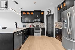 Built by Kratz, the recently updated 5-bedroom, 3.5-bathroom home in the Creeks combines modern finishes with everyday comfort(no carpet throughout). The spacious foyer opens to an inviting main floor with 9’ ceilings and engineered hardwood flooring with a gas fireplace. The kitchen features dark maple cabinetry with soft-close drawers, quartz countertops, a granite sink, a glass backsplash, stainless steel appliances, and direct garage-to-pantry access for easy unloading groceries. Tiled bathrooms and laundry complete this main space. The bright and spacious living area flows into a 25 by 14 oversized deck, featuring a glass railing & built-in garden/flower boxes (as is a condition). This space is perfect for entertaining, with professionally installed in-ceiling speakers in the main living area and on the deck. The fence is TREX/PVC, which is low-maintenance & long-lasting, a landscaped yard with vibrant perennials, and a garden shed complete the outdoor area. The open glass and engineered wood staircase leads to a large bonus room on the second floor. The bonus room is pre-wired for surround speakers(speakers not included). The bonus room is ideal for an office, media, or family space. The luxurious primary suite offers a walk-in closet and spa-style ensuite with heated flooring, dual sinks, a jetted tub, and an oversized shower. There are two more spacious bedrooms and a full bath to complete this level. The builder-developed basement boasts a spacious Theatre rec room with a built-in projector screen ideal for family movie nights or entertaining guests, 2 additional bedrooms, a walk-in/ storage, and a ¾ bath completes the basement. The partially heated triple-garage with one one-bay partition wall has a rear overhead door to the yard; this can serve as a good space for a home business. Additional features include Central air conditioning, a central vacuum, motion light sensors & dimmers. Book your view with your agent. As per the Seller’s direction, all offers will be presented on 09/23/2025 3:00PM. (id:27)