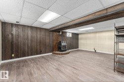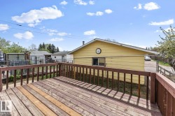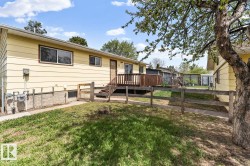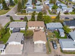 Inviting family home that exudes warmth and comfort! Bright and airy living room with hardwood floors. Charming kitchen with glass display cabinets and large dining area has sliding door that leads to the back deck, providing an ideal spot for outdoor relaxation. 4 bedrooms + 3 baths including a convenient half bath off the back entrance with direct access to the primary bedroom. Basement is fully developed with newer vinyl plank flooring, creating a modern and comfortable retreat with spacious rec room, cozy wood stove, laundry area and plenty of storage space. Upgrades throughout the years include main level paint, kitchen/ dining flooring, trim, shingles & HE furnace. Fenced and landscaped yard, complete with fruit trees, concrete sidewalks and a detached double garage. Paved parking off back alley ensures ample space for vehicles and guests. Perfect Place to Call Home!