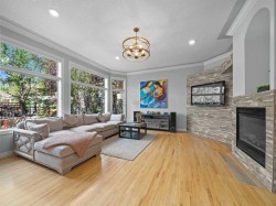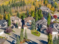 California-built home, perfectly nestled in a quiet sought after cul-de-sac just one lot next to Fish Creek Park. A perfect blend of luxury, comfort, and functionality. Exposed aggregate driveway leads to an oversized triple tandem fully finished garage. As you step inside you’re greeted with soaring 10-foot knock-down ceilings accented with elegant crown moulding, wide-open living areas, and a wall of windows that flood the space with natural light. The gourmet chef’s kitchen has been beautifully renovated including high end stainless appliances, granite countertops, custom cabinetry, and a stunning 10' single-slab breakfast/prep bar. Just off the kitchen, you'll find a huge walk-in pantry with its own fridge, a walkthrough mudroom, and main floor laundry, complete with a convenient laundry chute from the primary suite, and pet access to the enclosed dog run. As you make your way upstairs, you'll discover a generous sized room which could dub for a nanny suite or even a gym, equipped with its own 4 piece en-suite bath. This is the perfect bonus room or just a 4th bedroom you decide! A few more steps to the additional bedrooms where the hallway overlooks the main floor. The primary bedroom offers a sitting area overlooking the park where you can read a book, have a coffee and just relax. A fully remodelled spa -inspired en-suite features his and hers vanity's a gorgeous soaker tub and steam shower with a spacious walk in closet. Comfort features include air conditioning on the upper level, central vacuum, an irrigation system, and Hunter Douglas blinds with blackout shades in every bedroom. The fully finished basement offers an additional family room with a fireplace and a mini bar, two more bedrooms and another 4 piece bath., perfect for the gamer/musician in the house. New carpet throughout adds warmth and modern comfort. Located in one of Calgary’s most desirable Estate communities, this spectacular home offers the best of both worlds—a peaceful, private retreat surrounded by nature, yet just minutes to schools, shopping, and all the amenities of urban living. This is a rare opportunity to own a true showpiece. Schedule your private tour today. This home is priced to sell!