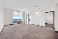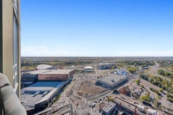 Perched high on the 32nd floor, this stunning south-facing unit offers breathtaking panoramic views of the Rocky Mountains and Stampede Grounds through floor-to-ceiling windows. With soaring 10 ft ceilings, the space feels bright, open, and luxurious. The kitchen boasts granite countertops, stainless steel appliances, and a stylish backsplash; a perfect place for creating delicious meals for yourself and guests. A massive living room makes the most of the incredible views with floor to ceiling south facing windows giving you a magnificent space to curl up with a good book and gaze at our wonderful city. The spacious bedroom features a walk-through closet leading into the bathroom; a great place to rest your soul after a day of fun and adventure. To further support your carefree lifestyle this home also includes air conditioning, titled underground parking and a storage locker for your convenience. The building offers resort-style amenities including concierge service, a large fitness center, hot tub, steam room, theater, and party room. This condo is the idyllic home for you with stunning views, luxurious space and amazing amenities all within your own building.