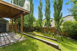 Beautiful Walkout Home in the Heart of Tuscany! DARE TO COMPARE! 1900+ sq.ft. Two Storey, Fully Finished Walk-out, South Backyard. Nestled in one of Calgary’s most sought-after communities, this well-appointed home offers easy access to Stoney Trail, Crowchild Trail, and the mountains, while being just minutes from the Tuscany Club, LRT station, top-rated schools, shops, parks, scenic walking paths, and a licensed daycare.The main floor features an open-concept layout with a cozy living room complete with gas fireplace, a bright island kitchen with a corner pantry, and formal dining area. Adjacent to the eating nook are patio doors leading to the elevated south-facing deck. A convenient main floor laundry area and powder room complete this level.Upstairs, you'll find a rare and functional layout with a spacious vaulted natural light filled family room with skylights centered between the primary bedroom and additional bedrooms, providing desirable privacy and separation. Two skylights flood the upper level with natural light.The fully finished walkout basement includes a generous recreation room with access to the lower patio. Also on this level is a fourth bedroom, den, and a 3-piece bathroom—ideal for multi-generational living, a home gym, or office space.The front and backyard are beautifully landscaped and feature mature trees (including fruit bearing), flowering shrubs, and a fountain, providing a peaceful oasis feel.This home is perfect for families and investors alike. The walkout basement offers excellent potential for a future legal secondary suite, subject to City of Calgary approval.Move-in ready and full of charm—book your showing today and make this home yours!