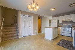 This well-maintained 3-bedroom with attached garage, two-storey townhouse offers low condo fees, spacious living, and is located within walking distance to Klarvatten Lake. Step into a bright and inviting living room filled with natural light. The large kitchen features a stylish movable island and opens to a private deck that backs onto green space — perfect for relaxing or entertaining. A convenient 2-piece bathroom completes the main floor. Upstairs, you’ll find three generously sized bedrooms, including a primary bedroom with a large closet, and a full 4-piece bathroom. The lower level offers a finished and large laundry room and an oversized single garage with bonus storage room. Some photos in this listing have been virtually staged to help showcase the potential of the space. The unit has recently been painted, offering a clean and refreshed appearance. Located close to parks, schools, public transit, shopping, and offering a quick commute to the military base, downtown, and the Henday.