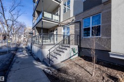 Welcome to urban sophistication at Glenora Gates! This PET FRIENDLY, 1 bed/1 bath unit offers a seamless open-concept design with soaring 10' ceilings, freshly painted interiors & abundance of natural light. The spacious bedroom features a generous walk-in closet, offering ample storage for your wardrobe essentials. A well-appointed galley kitchen is the central hub & includes a raised island eating bar. Step outside to discover the expansive balcony, gated for privacy & featuring direct access to the sidewalk—a coveted spot for those seeking a commercial unit to welcome clients! Alternatively, it's an ideal space for pet owners, providing easy access for walks or enjoying fresh air. Additional highlights: in-suite laundry, A/C & underground parking for convenience and security—a true rarity in urban living. Located in the heart of Glenora, between the vibrant Brewery District and the eclectic shops and restaurants along 124th Street, Glenora Gates ensures you're always at the center of urban living.