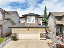 Stunning Former Showhome | Move-in Ready! Welcome to the Daytona Sentra IV, a stunning home with vaulted ceilings, walnut hardwood, and a chef-inspired kitchen featuring ginger maple cabinets, upgraded Quartz countertops, and a corner pantry. Enjoy flexible dining with a breakfast nook and formal dining room. The main floor offers a bedroom and full bath. Upstairs, unwind in your private primary retreat with a large walk-in closet and beautiful ensuite with Quartz counters, double sinks, and a jetted tub. The fully finished basement includes a family room with fireplace, two bedrooms, and a 3-piece bath. Exterior highlights include Eldorado stone accents, an 18x12 patio with pergola, full landscaping, and a finished 24x24 garage. Additional features: central A/C, built-in speakers, and security system. Ideally located near amenities, this home is the perfect blend of comfort and style!