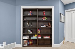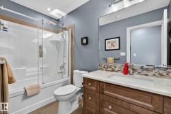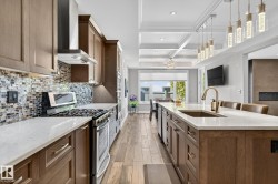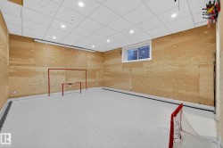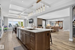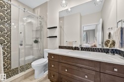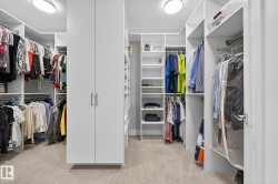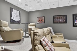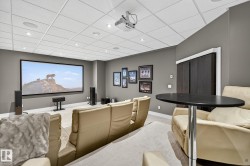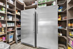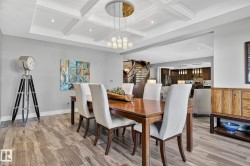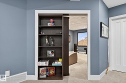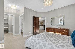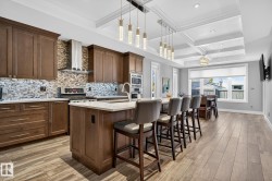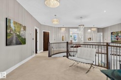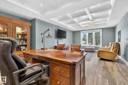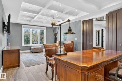 Exquisite custom-built estate in the prestigious Properties of Donsdale, one of Edmonton’s most sought-after communities. Offering 6,952sqft just steps from the river valley, this home seamlessly blends luxury, functionality & craftsmanship. Featuring an open floor plan with 9ft ceilings on all floors, spiral staircase, warm durable tile flooring & plenty of natural light. The chef’s kitchen stuns with quartz counters, dual ovens, dishwashers, fridges, massive pantry & coffered ceilings. Highlights include a presidential office, grand dining room, spacious mudroom. Upstairs, the primary suite offers dual walk-ins, a spa ensuite w/ heated floors, jetted tub & fireplace. Three additional bedrooms each enjoy walk-in closets & private ensuites + laundry & a cozy bonus room. The finished basement boasts zoned in-floor heat, wet bar, private HIDDEN BOOKSHELF theatre, multi-TV sports area, hockey & art room or 2 bedrooms. Oversized triple heated garage w/ drains & low maintenance turf yards + so much more.
