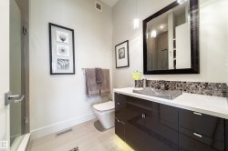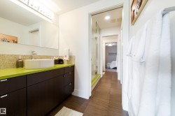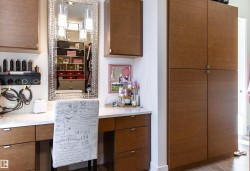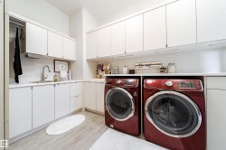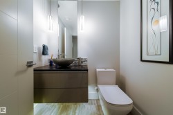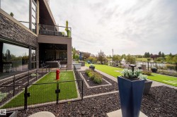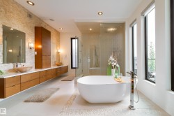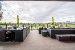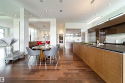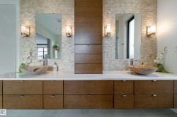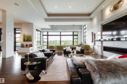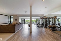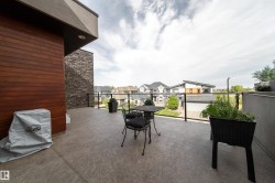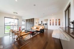 Absolutely spectacular estate home overlooking Edmonton’s premier waterfront oasis. Rare trifecta of stunning fountains and breathtaking views with the scenic 14th hole of Jagare Ridge Golf Course as the backdrop. Over 7157 sq feet of European designed total living space finished with meticulous modernist craftsmanship & oversized floor to ceiling windows. There are no comparables to this exquisite masterpiece with high ceilings on all 3 levels, 5 feature decks, 20 ft entertaining centrepiece & an elegant kitchen with grand island. The study on the upper floor can easily be converted to 2 more bedrooms. Unique features from the 2 level wine room, floating exterior to interior stone entry, custom cable railings & steel floating staircase encased in glass abound throughout. Full home automation, multi-purpose theatre, exercise facility, dual fully screened outdoor rooms and a New York penthouse inspired Owner’s Suite awaits. Renderings show the option to convert the upstairs office into two bedrooms.