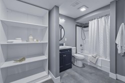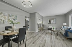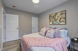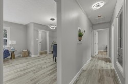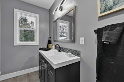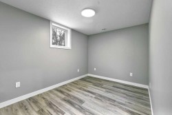 Beautifully updated from top to bottom, this reimagined Woodlea bungalow blends modern style with timeless charm in one of Red Deer’s most sought-after neighbourhoods. Located on a quiet, tree-lined street and backing directly onto Woodlea Park, this home offers unbeatable lifestyle, privacy, and green space access.The main floor features new vinyl plank flooring and a brand-new kitchen with quartz countertops, sleek cabinetry, upgraded lighting, and brand new appliances. The kitchen has been opened into the living space and features a large quartz eating bar while maintaining the 1950s curved corners and ceilings; maintaining its charm and heritage. Large windows fill the space with natural light, complementing two spacious bedrooms and a fully updated bathroom.The lower level has been gutted back to studs and renovated with new insulation, drywall, new egress windows, a stylish wet bar with large fridge, generous family room with 1500 watt electric fireplace with LIFX app controlled colorful lighting, custom mantle/fireplace wall. The basement includes an optional office/bedroom, full bathroom, and massive floored laundry/utility space that is clean and ready for you. This basement space has been redesigned with entertaining in mind. Comfortable, bright, and functional—this level nearly doubles your living space.Major systems have been completely modernized, including a full electrical rewire & panel (2025) and newer hot water tank for long-term peace of mind. Roof was done in 2013.