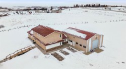 Exceptional 24.02-acre property with breathtaking 360° views of the countryside, sunrises, sunsets, and the Rocky Mountains. Fully fenced and gated, this former licensed commercial operation features extensive concrete walkways, patios, and aprons. A year-round headwater spring feeds three connected ponds with agricultural water rights. The home offers a wrap-around deck, walkout lower level, hardwood floors, 3 bedrooms, multiple baths, a Vermont Castings wood-burning heater, spacious rec room, and ample storage. A well-designed fully PERMITTED commercial complex (cost to build today $800k) includes a 2-storey COMMERCIAL CODE building, warehousing/storage,/studio attached via a reception/office is a huge workshop with 12’x12’ overhead door. All are extensively serviced with hydronic heating, heated concrete floors, A/C (select buildings), Vacu-Flo, radon mitigation, security and intercom systems, hail-resistant roofing, and robust utilities. Well and 3,000-gallon cistern, softened and distilled water, multiple hydrants, stock waterer, annually maintained septic, grid-tied SOLAR system ($70k) with surplus power credits, and standby diesel generator.Ideally located with quick access to Calgary & Okotoks, also on a school bus route, with hayed fields and excellent potential for subdivision, secondary suite, or home-based business (County approval required).