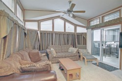 Home away from Home Year round living at Pine Lake with w/indoor pool, hottub, fitness room, pro-shop, lakefront lounge/patio and pro-shop. 18 hole golf course out the back door plus all the fishing & water-sports. Condo fees are low, which include lawn and snow care, sewer, water, garbage , and access to the resort amenities ,activities. & water sports. This 2 bathroom 1 bath park model has an open concept. The kitchen features gas stove, built-in china cabinet, pantry, lots of cupboards and a spacious dining room. Living room features lots of natural light, ceiling fan & patio doors leading to a covered deck protected from wind, rain & snow with natural gas BBQing, plenty of space for entertaining your quests during those long summer evenings. Storage shed, fire pit, concrete parking pad and full landscaped. This well kept property also includes a golf cart!!