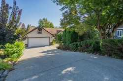 An excellent family home on a gorgeous 11360 sqft lot! Amazing private backyard w/ park like setting and tons of room for kids to play! Enjoy mature trees and hedges for ultimate privacy + plum, pear, apple trees! This 2425 sqft home has a great layout starting w/ open concept kitchen, loads of counter/cabinet space and open to dining/living area. Great natural light throughout! 3 bed + a den on main floor + full bath! Large Basement has separate entry and is set up for in law suite! Massive utility/storage room w/ separate access. Mountain views off the back deck! Double garage w/ newer door, Roof done 2008 and just professionally cleaned/treated, driveway sealed 2025, new deck boards, NEW AC and Furnace! Central location, minutes to grocery, restaurants HWY 1, trails, parks + more!