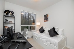 A bright corner-style home in Byrnepark w/panoramic windows & a treed, private outlook. A large kitchen island anchors the modern kitchen w/full-height cabinetry & stainless appliances. The living & dining area flows out to a covered balcony facing greenery, an easy spot for morning routines. The primary bed includes a redesigned closet, custom accent wall, built-in dresser, & a makeup area w/mirror & shelving, plus a spa-like ensuite w/a double vanity & clean stone finishes. The 2nd bedrm sits on the opposite side of the home for added separation. A tucked-away entry & laundry keep everyday clutter out of sight. Soft drapery, smart heat controls, window nets, & a balcony door net add comfort.
