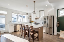 Beautiful, functional, and affordable, with 2 separate, legal suites generating $3090 per month income. The main house is 4 bedrooms upstairs, plus a rec room for the kids in the basement. Less than 4 years old, it shows like new, with quartz counters, large pantry, floating shelves, and huge island in the kitchen, 3 bathrooms including a 5-piece ensuite with separate shower and soaker tub, wood-plank ceilings, fireplace, AC, and a large patio extending along the entire back of the house. Fenced backyard with artificial turf for easy maintenance. Parking for 6 cars. Separate 1-bdrm suite in basement, with 6 appliances. Separate 1-bdrm carriage home with 6 appliances above the 2-car garage, with its own utility meter. Stunning mountain views, and surrounded by parks and trails.